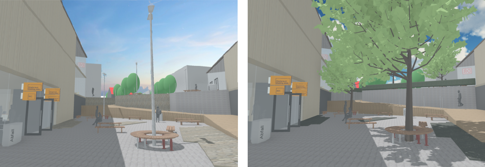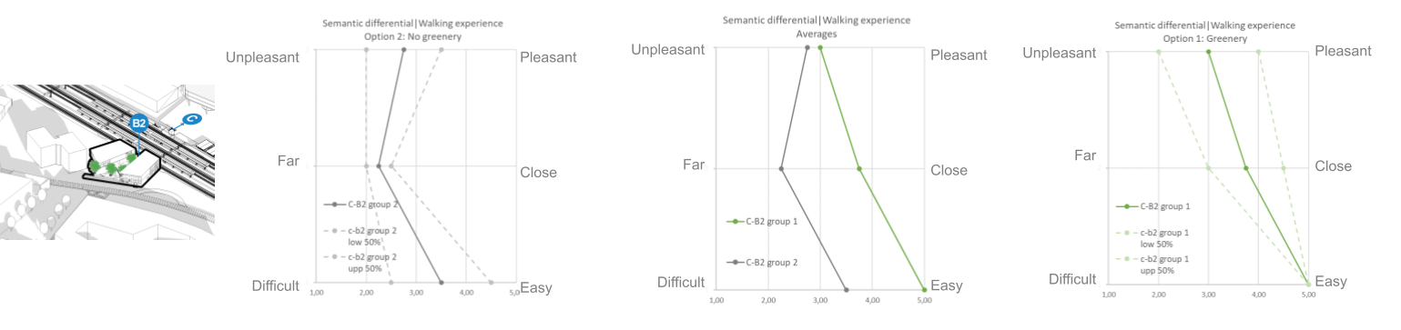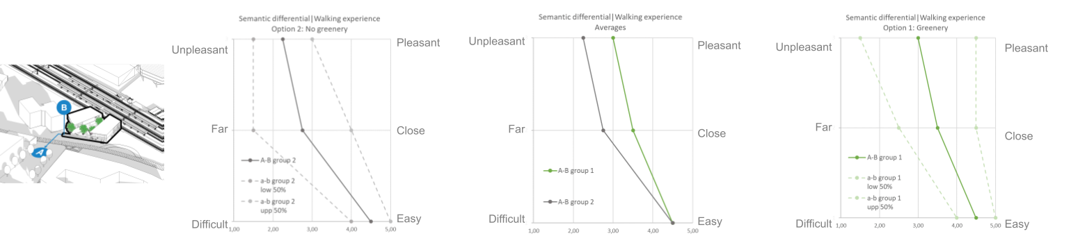 A partir de este diseño se decide estudiar dos variables: la presencia de vegetación y la forma de la rampa. Para ello se elige una muestra de 15 estudiantes que visitan virtualmente (a través de gafas RV) las opciones de diseño y las puntúan en función de una serie de parámetros seleccionados.