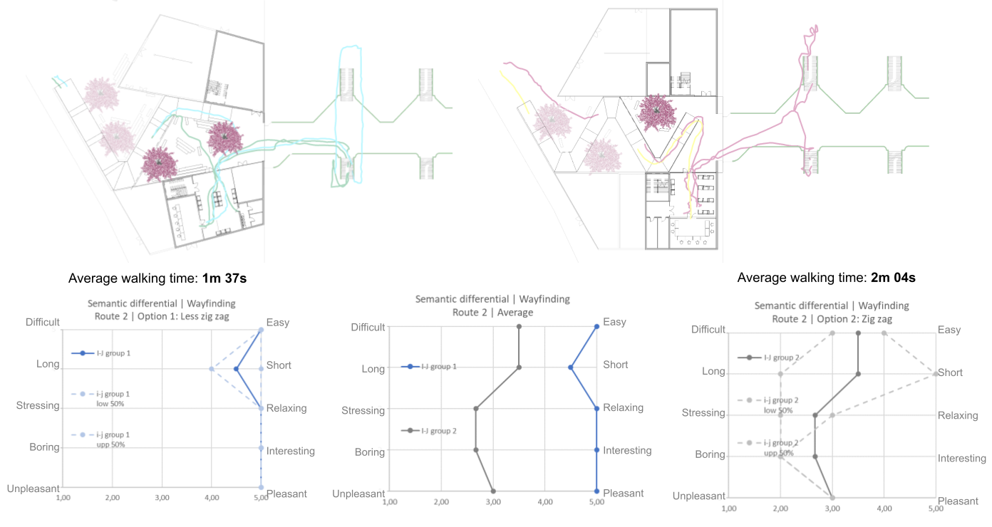 El primer punto a analizar será la orientación. Para ello se les pide a los usuarios que sigan los recorridos A-B y C-B2 y se puntúan según el agrado y la dificultad del recorrido. También se miden otros parámetros físicos la trayectoria y duración de los recorridos. Ambos valores se comparan para intentar establecer una relación.
